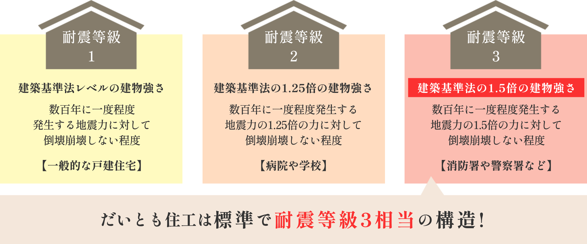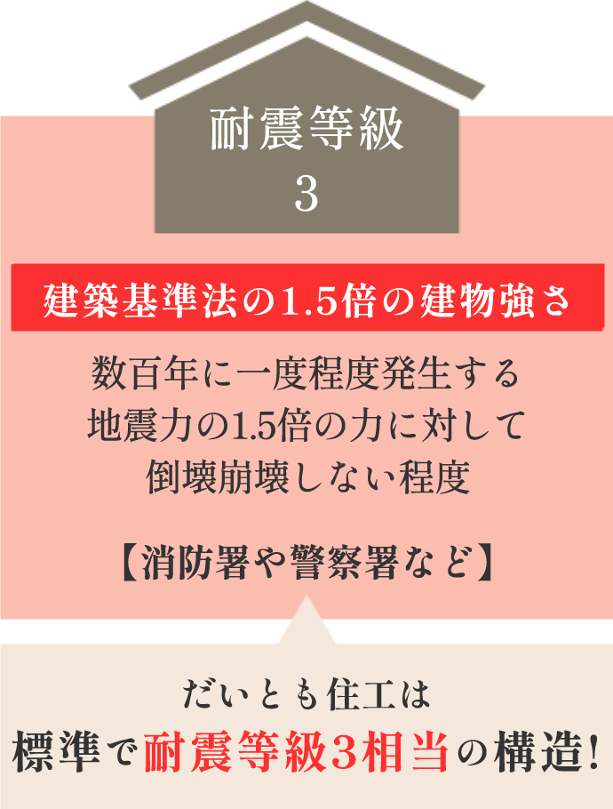 『耐震等級3』は、住宅性能表示制度で定められている耐震等級の中で最も高いレベルです。これは震度6強~7の大地震が起きても軽い補修程度で住み続けられる想定をしている水準で、災害時の拠点となる消防署や警察署などの基準に相当します。