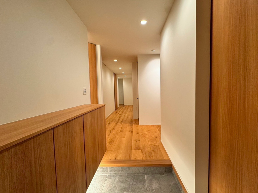 日常の動線、M様の暮らし方に合った間取りや内装を試行錯誤し、玄関から真っ直ぐつづく廊下はゆったり幅広にして、悠々とした佇まいが印象となります。